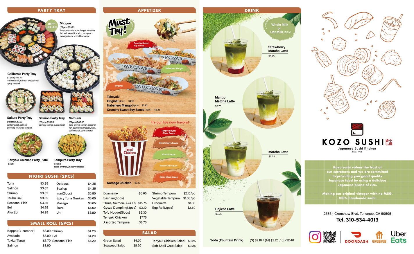 Kozo Sushi’s motto is to inherit the Japanese philosophy and make it easy for customers to enjoy delicious sushi. Kozo Sushi Values the trust of our customers and we are committed to providing you good quality Japanese Food by using a delicious Japanese brand of rice and our original vinegar with no MSG. 100% handmade sushi from classic sushi to creative rolls, sets, combos, bowls and party trays, we have a wide range of menus to suit your needs.